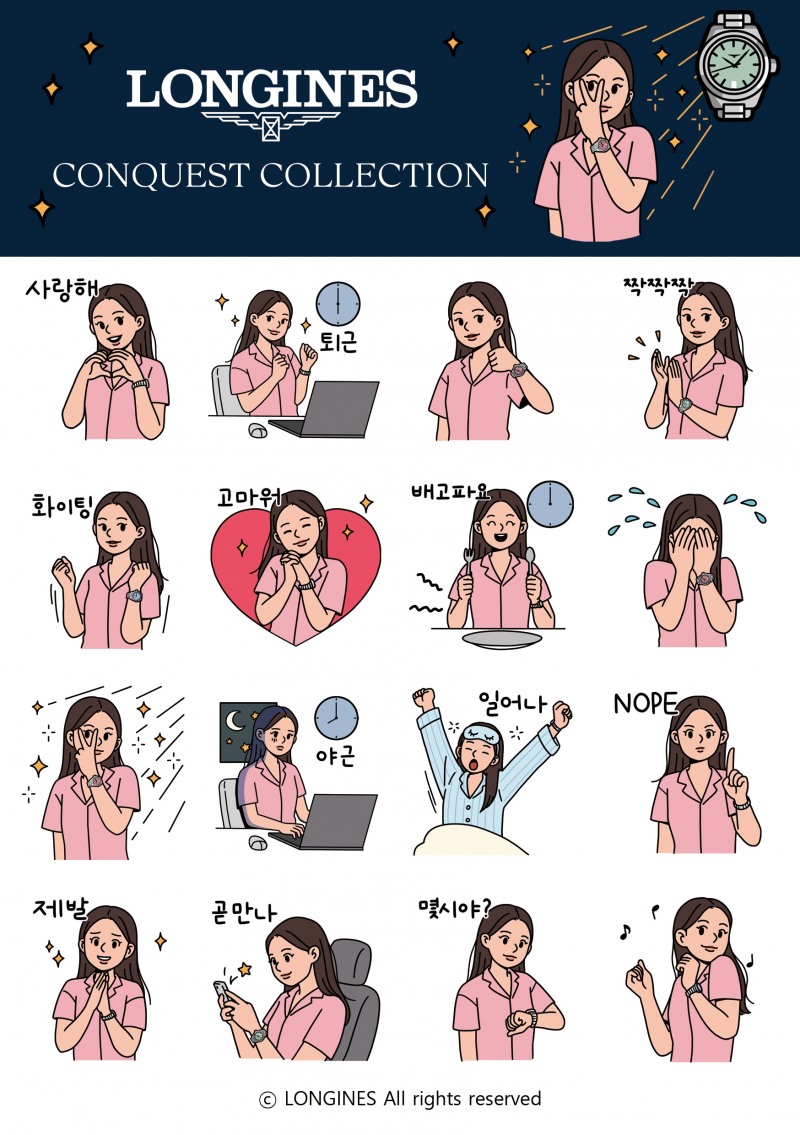 이 새로운 콘퀘스트는 스포티하면서도 우아한 데일리 워치로 재탄생했습니다. 이와 함께 론진은 인기 일러스트레이터 시나나 작가와 협업하여 이모티콘 16종을 제작했습니다. 이 이모티콘은 일상에서 자주 사용하는 표현에 론진만의 감성을 위트 있게 담아낸 것이 특징입니다.
