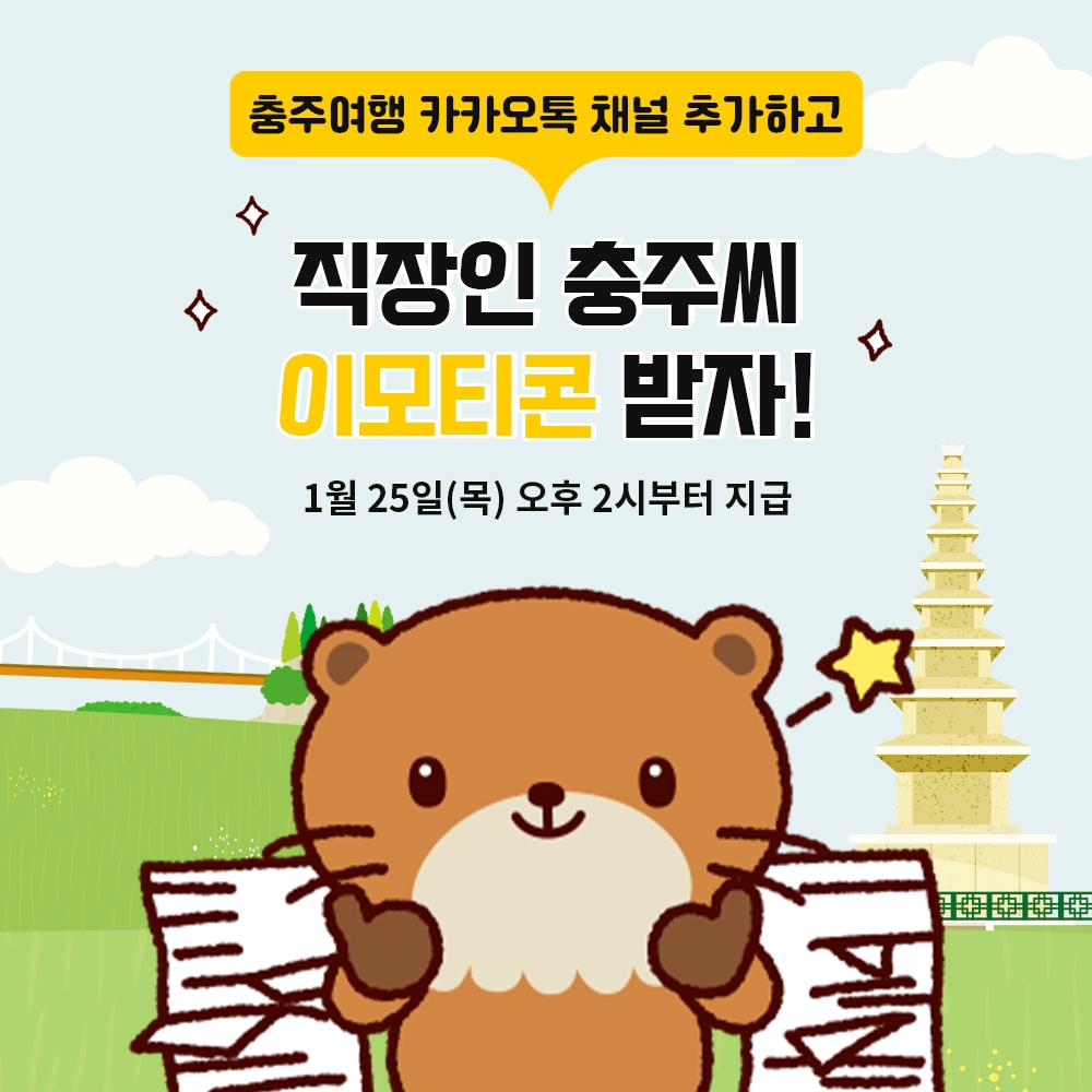 충주시는 채널을 신설한 기념으로 '충주씨' 이모티콘을 선착순 2만 5천명에게 증정하는 이벤트를 진행합니다.