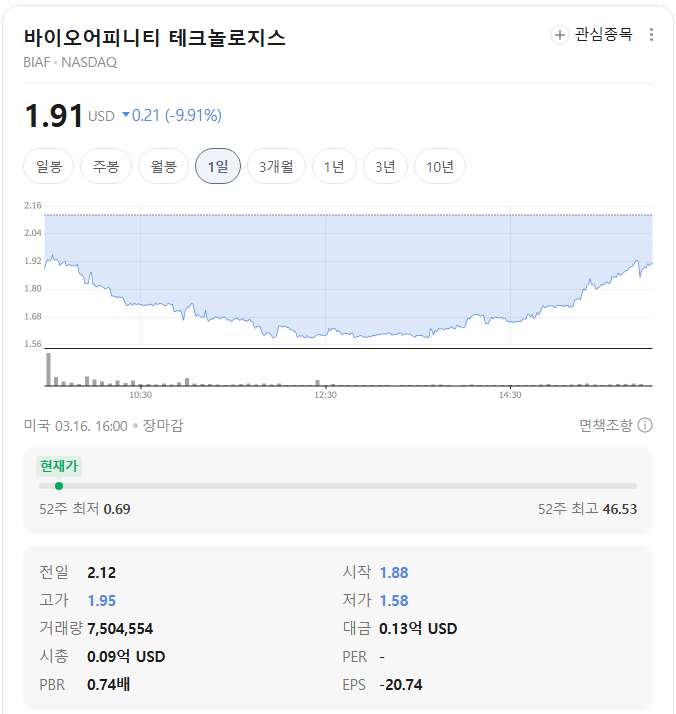 bioAffinity Technologies (BIAF)는 어제 하루 만에 주가가 98% 이상 폭등하며 투자자들의 관심을 집중시켰습니다. 핵심 요인은 임상 관련 기대감, 소형 바이오주 특성, 그리고 AI·바이오 테마 자금 유입입니다.