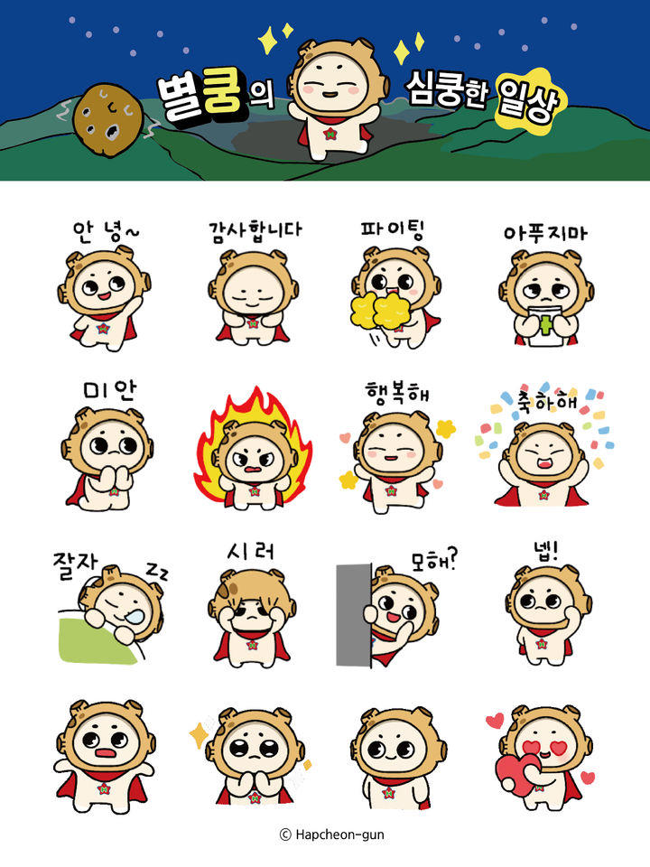 경상남도 합천군에서는 군수 김윤철의 지휘 아래, 사랑스러운 마스코트 '**별쿵**'을 주인공으로 한 새로운 카카오톡 이모티콘을 선보이며, 이를 기념하여 **무료로 나눠주는 행사**를 진행한다고 발표했습니다.